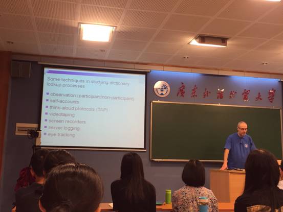 在本次讲座上,卢介绍了他关于研究词典应用的方法以及最新的技术,包括观察法,用户的自叙法,有声思维法,录像法,服务器记录法以及最新的眼动跟踪技术。接着,卢介绍他的两种研究范式,包括实证典范和自然典范。在谈到两者的差别时,卢强调道实证法重在验证一些相关性的假说,通常会通过一些实验或者调查。在词典学的用户取样时,一些典型的用户值得重视。比如,在词典用户中,大学生占据了很大的比例。而自然范式则多用于生成或者限制一些可行的假设,是定性研究的一种。在词典学中,自然范式主要运用在用户应用词典时的情境和过程。另外,卢教授还指出案例研究就是自然范式里的一个代表,具有很强的现实性,能够真实反映用户和词典之间的互动,并且能够从中得到可靠的数据。接着,卢教授提到现代技术在监视用户使用词典的过程上起到了巨大的作用。目前为止,相关的技术有视频和音频的录像,屏幕录像以及最新的眼动跟踪技术。在谈及眼动跟踪技术时,卢教授指出目前这项技术虽然不能解决所有的问题并且自身也存在着一些缺陷,但是它仍然是一个很有潜力,有待开发的技术。