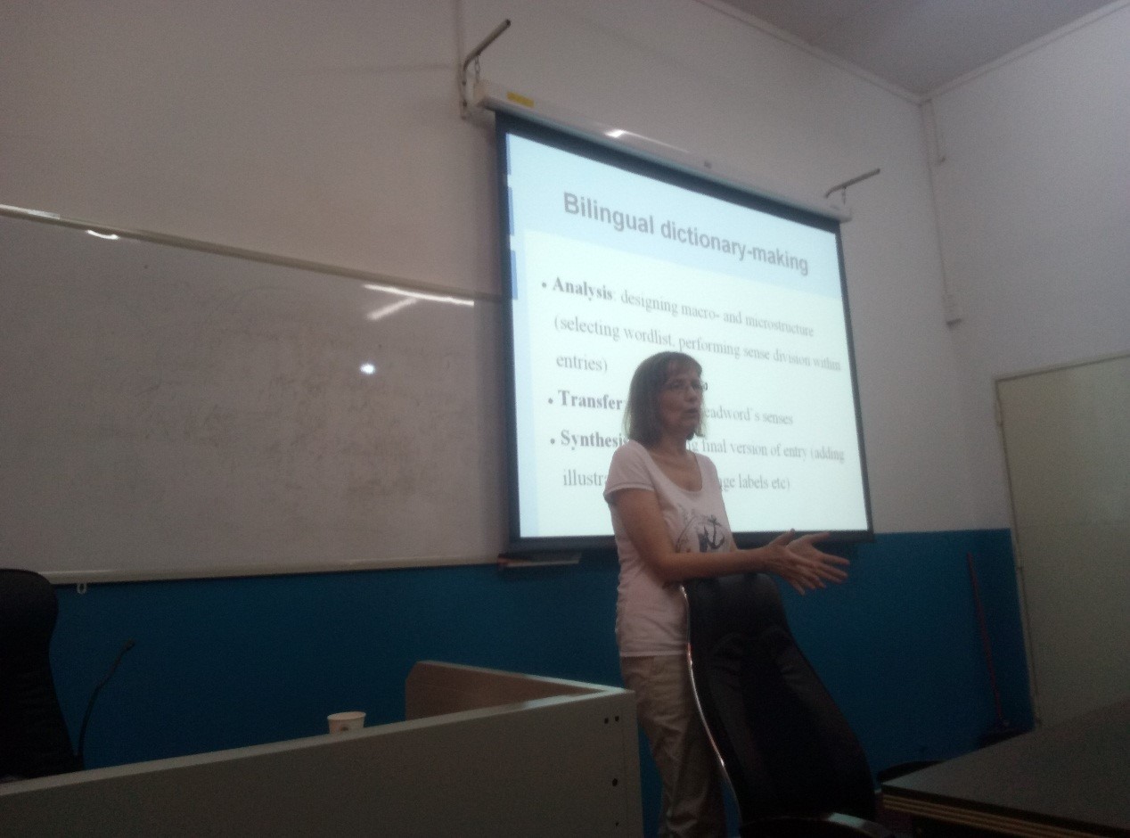 首先,Arleta教授为同学们介绍了编纂词典的基本步骤,如词典用户的确定、编纂队伍的组成、语料库的使用和编纂时间限制等。接着,教授简述了编纂词典时节省空间的常用方法,如缩写和波浪符的使用等。随后,教授就“complication”、“subsense”与“definiendum”等一些词典的专业术语进行提问,在座的同学们纷纷积极参与,踊跃回答。当说到词典释义的方法时,Arleta教授除了罗列了一些常用的方法外,还为同学们特别介绍了“SingleClause WHEN”的释义方法,让在座的同学们都受益匪浅。此外,Arleta教授指出了有些定义的不妥之处,让同学们在学习过程中多加留意。