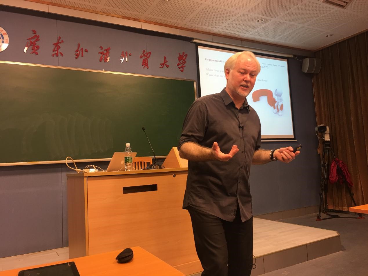 12月11日上午十点,词典学研究中心特邀著名语言学家Dylan Glynn教授在六教209教室举行了主题为“Theoretical Linguistics and twoLanguage Models”的学术讲座。Dylan Glynn教授是巴黎第八大学“英语母语国家研究部门”的主任,主要从事于认知语言学理论框架指导下的语义学研究,并在国际性杂志及著名刊物上发表了30余篇著作。本次讲座由词典研究中心主任章宜华教授主持。