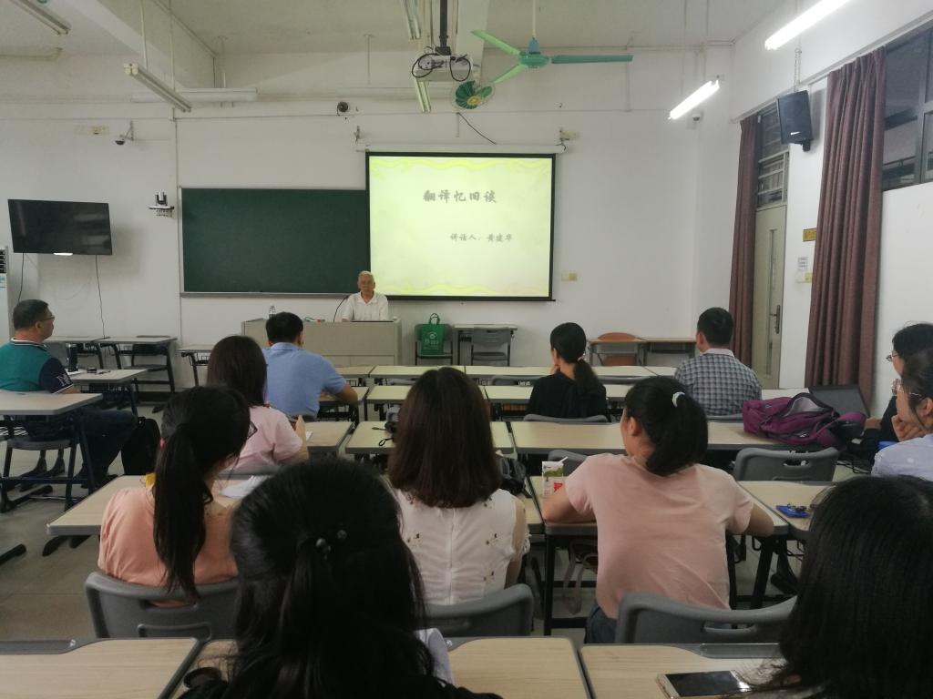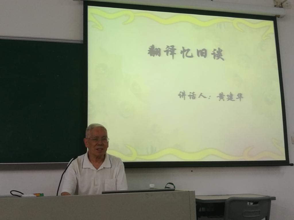 词典学研究中心于2019年5月23日15:00-17:00在北校区六教B407开展向模范人物学习的活动,我们有幸请到“南粤楷模”黄建华教授,为大家做题为“翻译忆旧谈”的主题演讲。在讲座中,黄建华教授给我们讲述他的翻译历程,让我们了解到他从事翻译之路的坚持不懈和勤奋刻苦。翻译不是一蹴而就的,需要持之以恒的练习和实践。其中,黄建华教授也讲述了他在联合国教科文组织从事会议议员的经历,以及翻译的法国总统著作,这些都为促进中法交流做出了卓越的贡献。