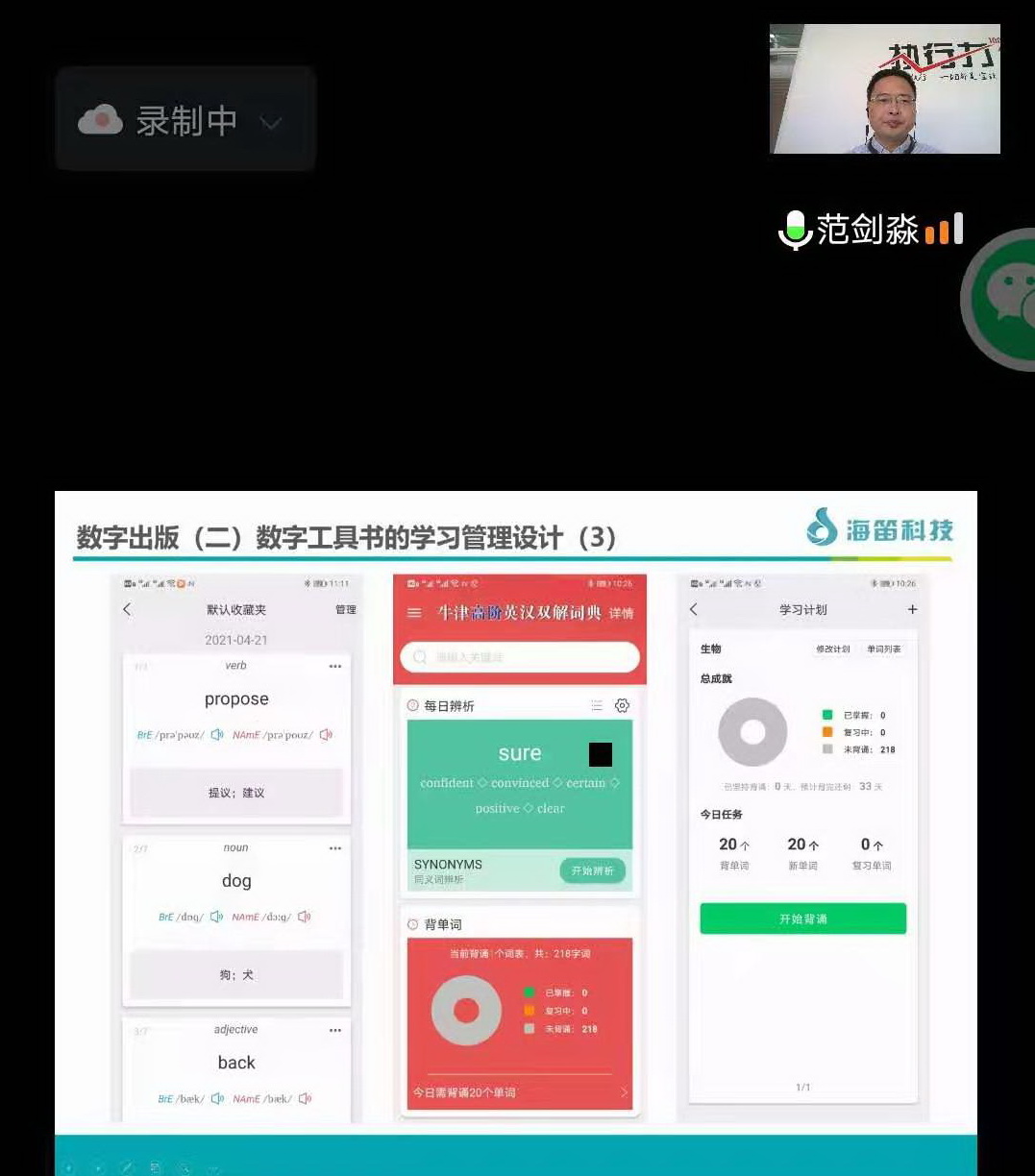 2021年4月29日14:30-16:30,海词网(Dict.cn)创始人、上海词海信息技术有限公司创始人和CEO范剑淼博士,在腾讯会议上给大家带来了“工具书数字出版与新时代语言知识服务”的精彩讲座。本次讲座由人事处、教师发展中心主办,词典学研究中心承办,章宜华教授主持。
